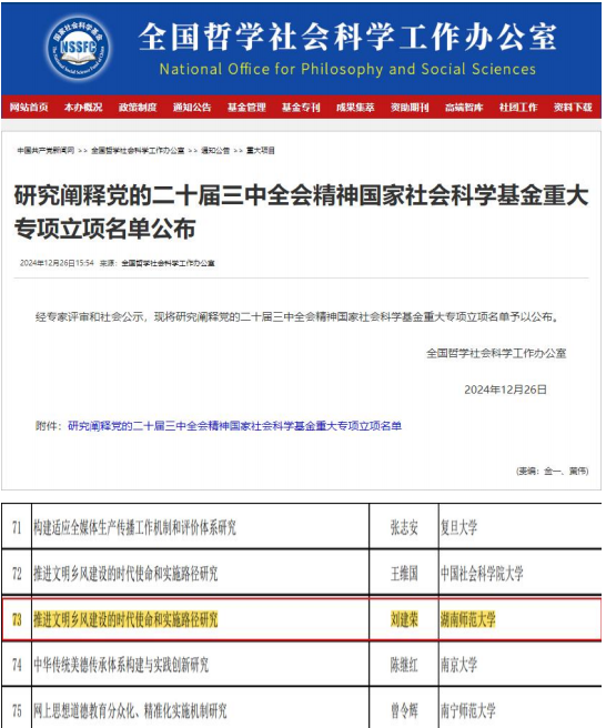 近日,全国哲学社会科学工作办公室公布研究阐释党的二十届三中全会精神国家社会科学基金重大专项立项名单。我院刘建荣教授申报的《推进文明乡风建设的时代使命和实施路径研究》获批立项。这是我院近年来第四个国家社会科学基金重大招标项目。
