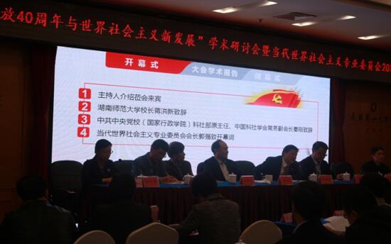 蒋洪新校长向与会嘉宾简要介绍了学校80年的发展历程及取得的重大成就。他认为,中国改革开放40周年之际召开的这次会议,既是世界社会主义发展的研究成果交流会、推广会,又是中国特色社会主义进入新时代、实现中华民族伟大复兴中国梦的大背景下,为坚持和发展新时代中国特色社会主义建言献策的动员会、研讨会。他希望与会学者能从历史和现实的结合中系统阐明中国特色社会主义道路来之不易;从理论和实际的结合中深刻解答新时代坚持和发展中国特色社会主义面临的一系列基本问题;从国际和国内的结合中准确把握世界社会主义发展的基本走向。科学总结世界社会主义发展的历史经验,深刻揭示世界社会主义发展的内在规律,前瞻把握世界社会主义的未来进程,提高理论素养,培养战略思维、辩证思维,增强中国特色社会主义道路自信、理论自信、制度自信和文化自信。