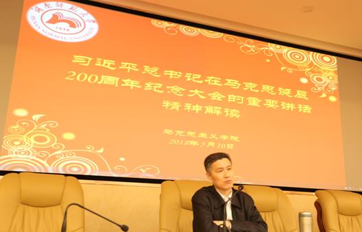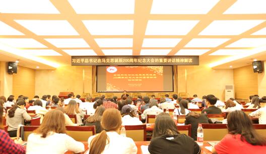 (供稿 行政办)5月10日下午,我院以解读习近平总书记在马克思诞辰200周年纪念大会的重要讲话精神为主题,组织了集体学习。吴家庆院长结合自己出席纪念大会、参加研讨活动的感想,为全院师生解读了习近平总书记的重要讲话精神。集体学习由学院党委书记陈红桂主持。