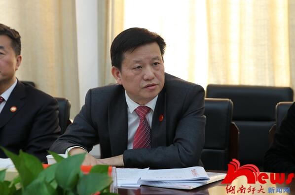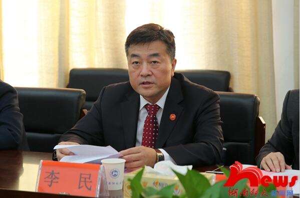 李民介绍了学校成立习近平新时代中国特色社会主义思想研究院的背景、目的和学校的优势。他说,在刚刚胜利闭幕的中国共产党第十九次全国代表大会上,习近平总书记在工作报告中鲜明地提出了习近平新时代中国特色社会主义思想和基本方略,深刻回答了新时代坚持和发展中国特色社会主义的一系列重大理论和实践问题,是新时代夺取中国特色社会主义伟大胜利的政治宣言和行动纲领。为我们把握新时代、夺取新胜利提供了新的战略指引。作为湖南省省属高校中唯一的国家“双一流”建设高校,我们必须责无旁贷地把学习研究、宣传阐释习近平新时代中国特色社会主义思想的重任切实承担起来,不断巩固马克思主义在高校哲学社会科学中的指导地位,不断推进马克思主义中国化的最新成果——习近平新时代中国特色社会主义思想进教材、进课堂、进学生头脑,不断增强习近平新时代中国特色社会主义思想的理论魅力、育人合力、落实效力,为推动党的理论创新、服务国家和地方经济社会发展提供更多、更新、更好的学理支撑和决策参考,为我们党在新时代进行伟大斗争、建设伟大工程、推进伟大事业、实现伟大梦想做出新的更大贡献。他表示,要努力将研究院打造成国内知名、省内领先的重要研究基地和宣传教育平台。