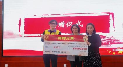 社会爱心人士代表、佛山嘉恒食品有限公司总经理温钊和、马克思主义学院党委副书记林峻、公共管理学院党委副书记孙雯波上台主持捐赠仪式