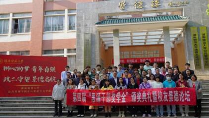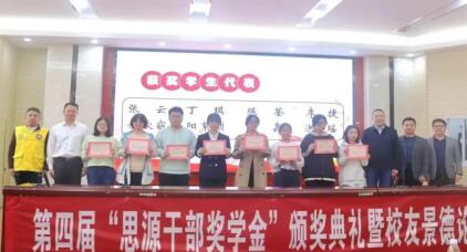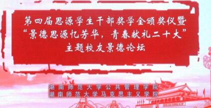 (通讯员 陈思然 陈星诺)4月1日,我院与公共管理学院联合举办第四届“思源干部奖学金”颁奖仪式暨校友景德论坛。社会爱心人士代表温钊和、邱军、胡展超、董严、李银生、邓乃根、刘锦英、谢叶松、计文勇、王喜梅、游国辉、何启明,优秀校友黄晔、万敏锐、杨小华、易茜、喻晓坤、田浩、陈世杰、刘松青,校团委书记陈天嵩,校友总会副秘书长邝洁,公共管理学院党委书记余望成、党委副书记孙雯波、胡建新老师,我院党委书记陈红桂、党委副书记林峻出席活动。
