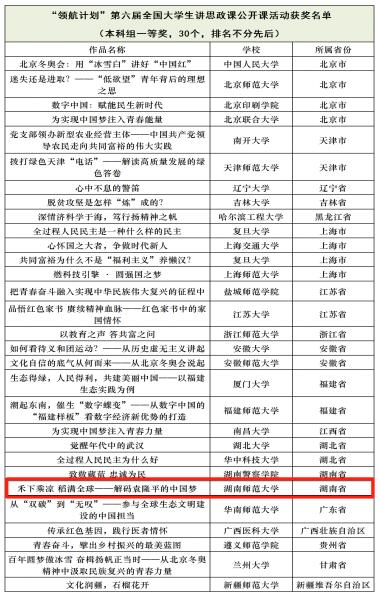 近日,由教育部办公厅组织的习近平新时代中国特色社会主义思想大学习领航计划主题教育系列活动获奖名单正式出炉。经专家评审,我院报送的《禾下乘凉稻满全球——解码袁隆平的中国梦》作品从全国34个省市脱颖而出,荣获“青春献礼二十大·强国有我新征程”——第六届全国高校大学生讲思政课公开课展示活动本科组一等奖。该活动由教育部高校思想政治理论课教学指导委员会主办、南开大学马克思主义学院承办。