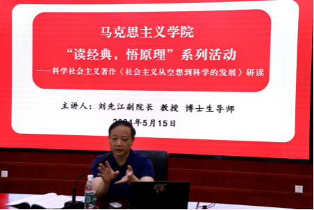 刘先江从“为什么要研读原著”与“为什么选读《社会主义从空想到科学的发展》一书”引入,首先分析了《社会主义从空想到科学的发展》的写作背景,点明经典要将其放在特定的历史背景中来读,强调读原著要密切联系实际,既要回到过去,又要关注现在,指导未来;接着对该书的写作框架进行探究,深入分析了其“思想来源”“理论基础”“基本理论”,帮助同学们理清了其中的逻辑思路;最后,刘先江教授以“理论的当代回响”为题,分析了现今社会实践中理论指导实践的已有成效,并警示同学们要明辨理论陷阱,要有自己的思考而不是随波逐流,要用科学的理论武装头脑、指导实践。