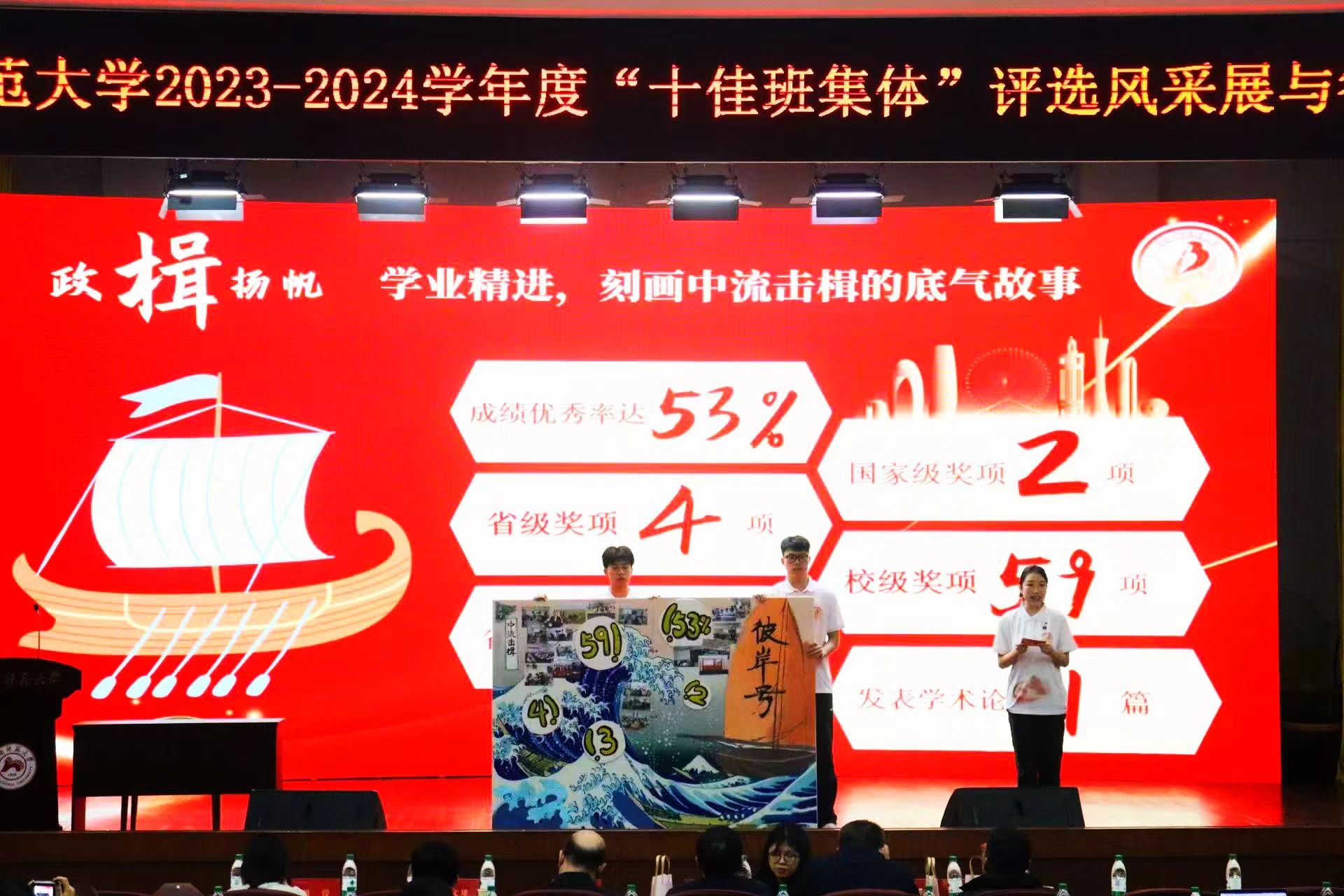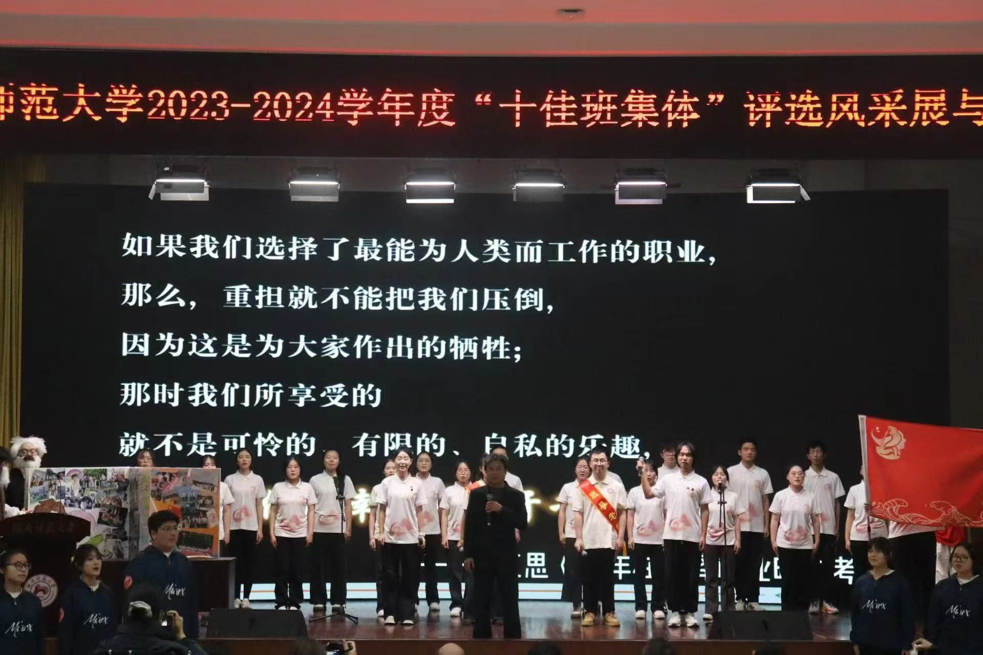 (通讯员 吴虹佳 何莉莉)12月10日晚,我校2023-2024年度“十佳班集体”评选答辩会在国际学术报告厅举行,经过激烈角逐,我院2023级思想政治教育三班以综合得分91.28分的高分获得了“十佳班集体”称号。此次评选答辩会分为班级风采展和提问答辩环节。全校23个参选班级根据学科专业特色,结合班级建设成果,通过精彩演绎展现了班级的良好风貌。