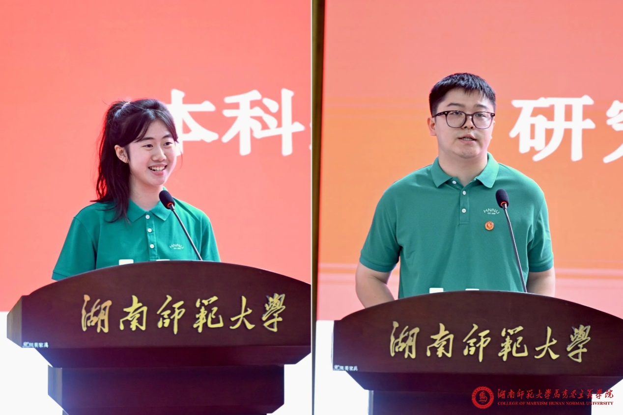 2025级本科生代表范恬田、研究生代表彭俊杰先后发言。他们表达了加入师大马院的喜悦之情,并围绕成长经历、未来规划和学科认识,分享了自己的精彩见解。两位同学号召全体新生同学要真学、真懂、真信、真用马克思主义,在理论和实践的结合中真正读懂马克思主义,对接国家发展需求,解决社会现实问题,展现马院学子的责任与担当。