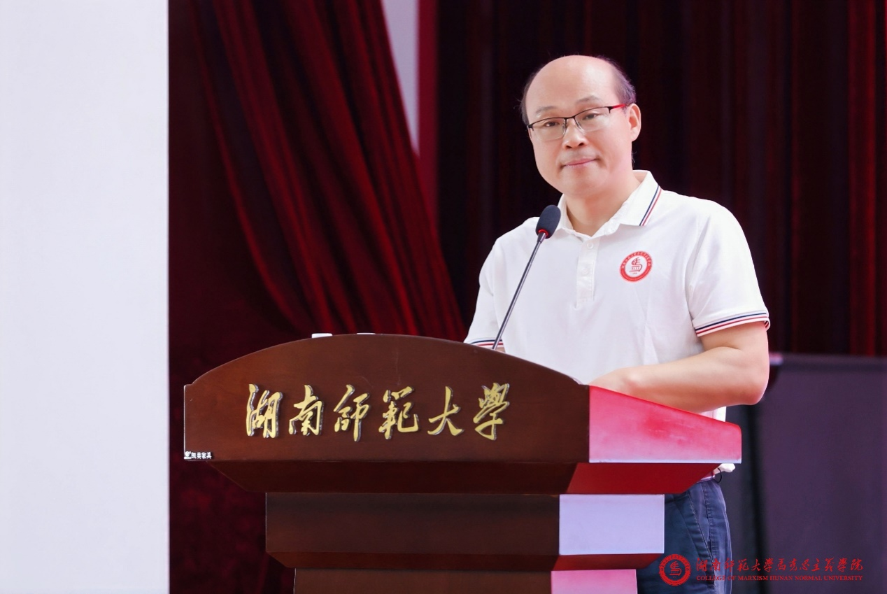 李泳波代表学院全体师生向2025级199名本科生,132名硕士研究生,24名博士研究生的到来表示热烈欢迎,并祝贺他们成为光荣的湖南师大马院人。正值中国人民抗日战争暨世界反法西斯战争胜利80周年,他号召全体新生主动认清时代责任,从历史启示中汲取力量,把个人价值的实现融入民族复兴伟业,与时代发展同向而行。借此机会,他向全体2025级新生提出四点希望:一是赓续精神薪火,凝聚奋进力量;二是扎根学术沃土,奋力拔节成长;三是效良师修己身,涵养高尚品德;四是坚持学以致用,勇担时代使命。他勉励全体新生以青春之我、奋斗之我,在湖湘精神的传承中吸收力量,在学术沃土的深耕中去奋力成长,在师者德行的浸润中涵养品德,在服务家国的实践中去勇担使命,让马克思主义真理之光照亮人生之路,照亮民族复兴的壮阔征程。
