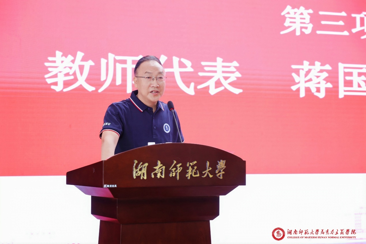 马克思主义学院二级教授,博士生导师蒋国海代表全体教师向全体2025级新生表示诚挚祝贺。他回顾自己在师大的多年求学、育人经历,以亲身体会号召全体学子树立科学的世界观、积极的人生观和正确的价值观。他指出,世界观、人生观、价值观是立身之本,也是马院学子的必修课,必须扣好“人生的第一粒扣子”。最后,他勉励全体新生在师大马院的沃土里练就过硬本领,在强国建设、民族复兴的时代伟业中奉献青春力量,展现青春风采。