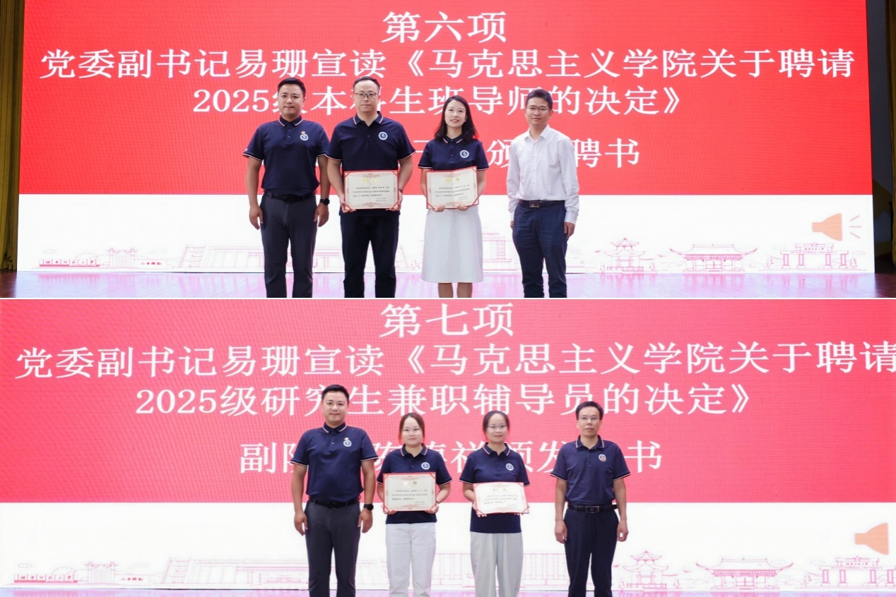 易珊宣读《马克思主义学院关于聘请2025级本科生班导师的决定》、《马克思主义学院关于聘请2025级研究生兼职辅导员的决定》,赵子林、陈德祥、易珊分别为2025级本科生班导师、2025级研究生兼职辅导员颁发聘书。