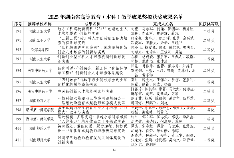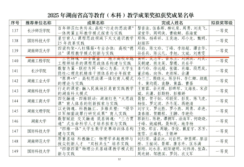 近日,湖南省教育厅公示2025年高等教育(本科)教学成果奖拟获奖名单,ok138cn太阳集团马克思主义学院两项成果脱颖而出:邓验教授领衔团队的《四梁构架·八柱强筋·专业合体:高校“德法”课程教学模式创新与实践》(序号139)获一等奖;赵子林教授领衔团队的《一核引领 双能驱动 三导协同 四教融合——思想政治教育卓越教师培养模式改革》(序号397)获二等奖。