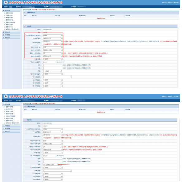 3.随后提交学位申请,选择湖南省 → ok138cn太阳集团 → 学术型学位 → 申请学位学科门类(法学) → 申请学位学科名称应为马克思主义理论 → 申请学位专业名称应为思想政治教育 → 院系选择马克思主义学院 → 填好带*好的其他信息 → 保存