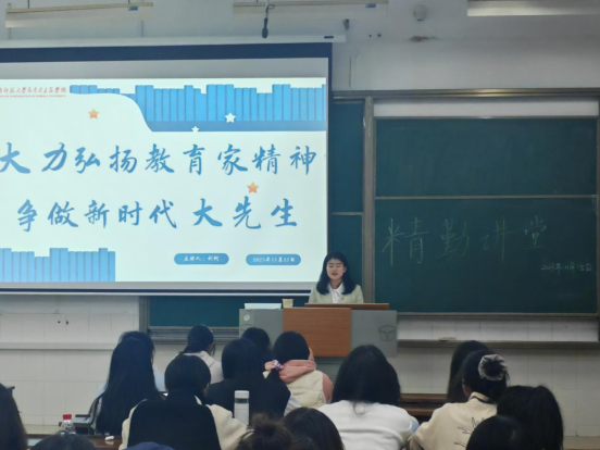 (通讯员 谭佳越 吕唯佳 肖丹)为树立师范生“躬耕教坛、强国有我”的志向抱负,推动新时代教师后备队伍的组织建设,我院团委青年创新创业指导中心于11月15日晚举办以“大力弘扬教育家精神,争做新时代大先生”为主题的精勤讲堂活动。此次活动由21级思想政治教育一班刘柯担任主讲人,由22级政二班、22级政三班、23级政二班联合承办。