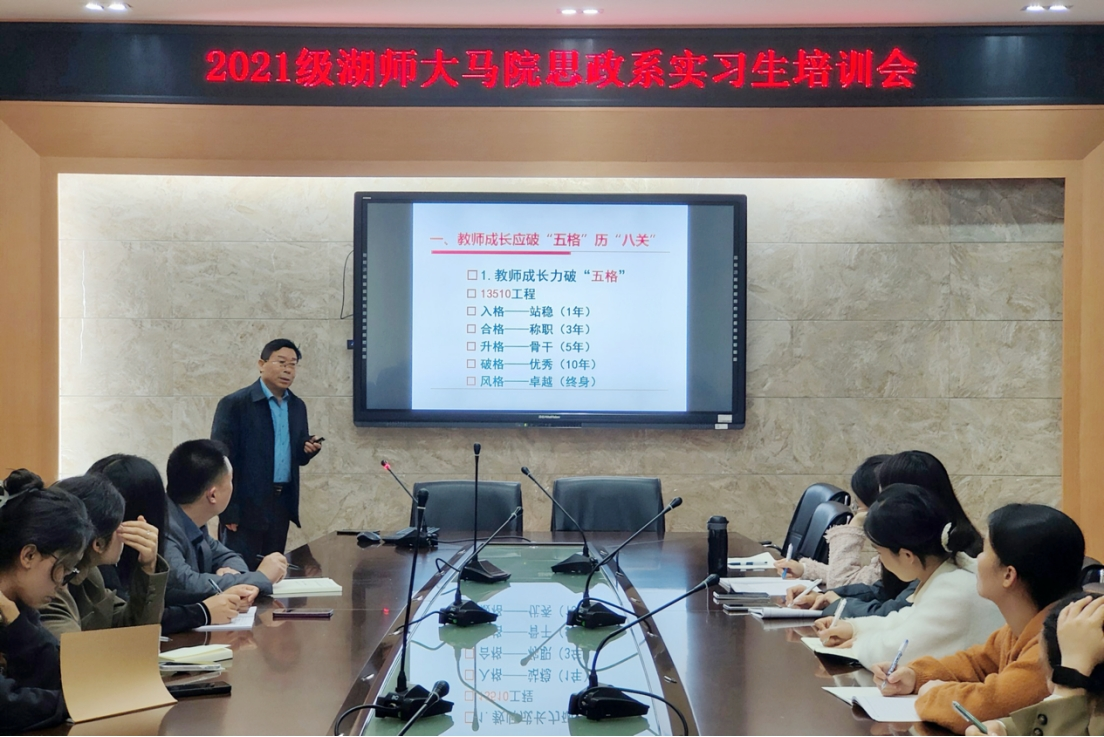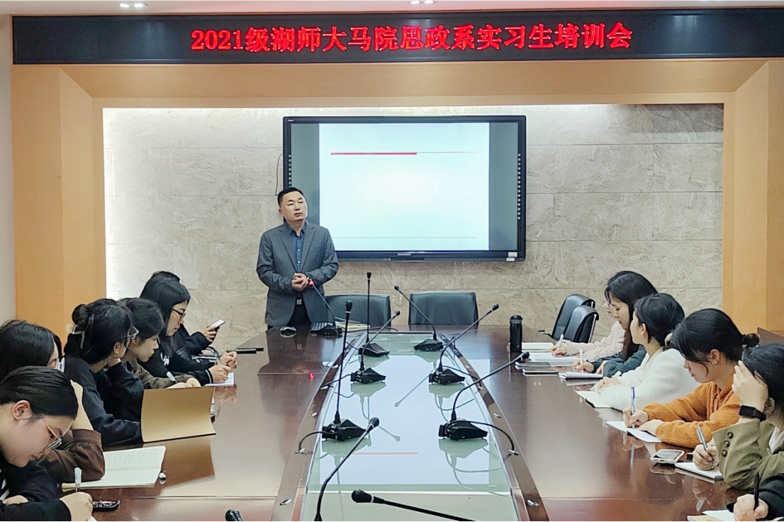(通讯员 刘扬宇 罗思瑶)4月3日下午,马克思主义学院思想政治教育系赴长雅中学实习队于长雅中学行政楼三楼会议室参加实习生培训会。长雅中学副校长吴刚主持此次培训会,开福区教育科学研究中心书记、开福区中学思政教研员陈红主讲,参会人员有实习队指导老师朱飞以及24位实习队员。