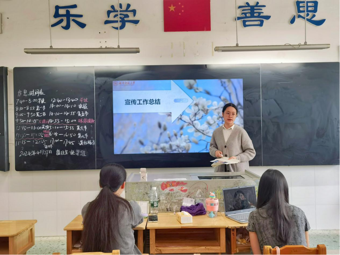实习队队长谢知含和实习队副队长罗谦慧、谭翠玲分别从队伍整体情况、教育教学、宣传工作三个方面进行总结。谢知含总结了实习以来整个队伍的情况,对近期存在迟到早退现象的部分成员提出改进要求;罗谦慧讲述了教学工作开展情况,提出整体教学的改进意见;谭翠玲阐述了宣传工作的成果、存在的不足以及后续的工作安排。