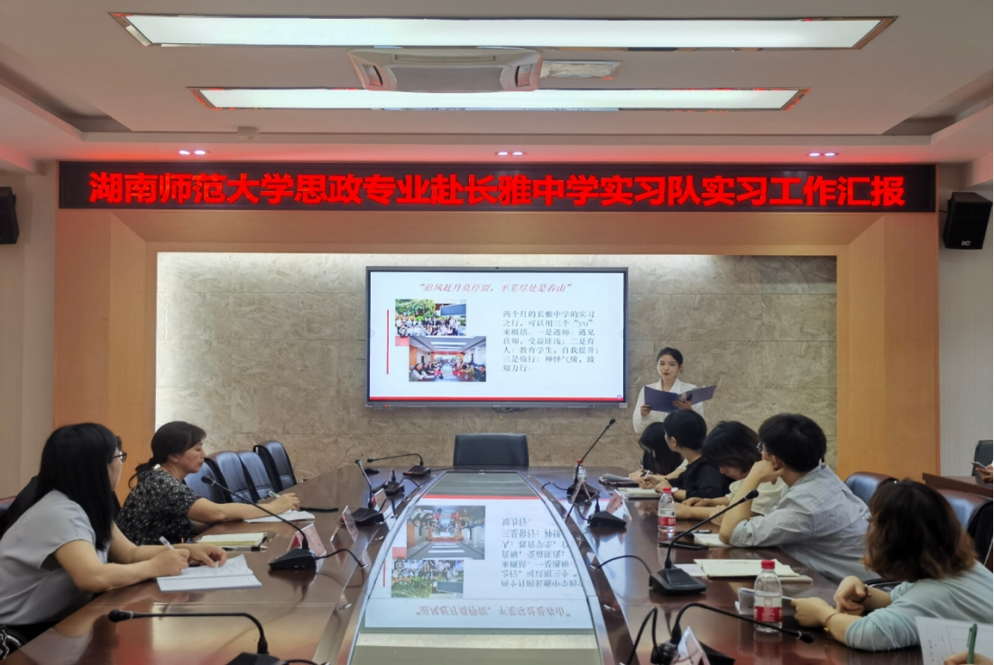 (通讯员 戴佳悦 曹湘)5月15日下午,我院赴长雅中学实习队于长雅中学综合楼三楼会议室开展实习工作汇报会。参与此次汇报会的有长雅中学教务处主任熊熠文,初三年级主任杜小露,政治教研组组长吴珂,初一年级政治备课组组长谭伟容,政治教研组老师们,马克思主义学院教授蒋国海,实习队指导老师陈文珍和朱飞,以及实习队全体队员。