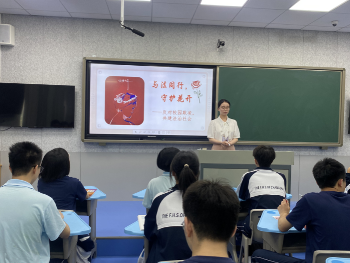 此次公开课展示活动由实习队副队长陈宝菁主持。实习队员罗国平以“探究文旅经济火热背后的政府作为”为总议题,通过“长沙为何成为‘网红’?”“从‘网红’到‘长红’政府何为?”两个问题依次推进,讲授《法治政府》相关内容;实习队员邓诗萌以反对校园欺凌为主线,从“以法为盾,护‘未’美好明天”“与法同行,汇聚法治力量”“守护花开,共建法治社会”三个层次带领学生学习建设法治社会的内涵、措施和意义。