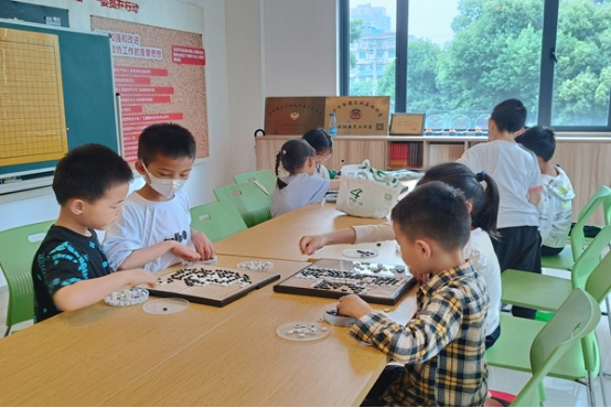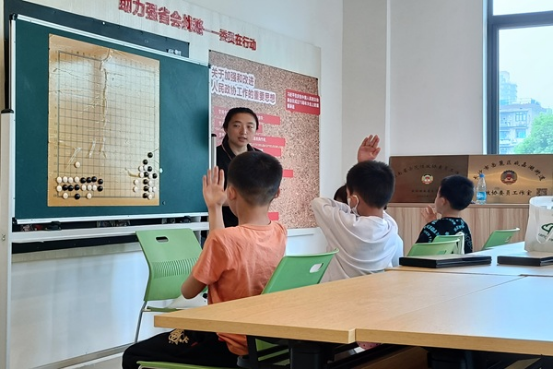 此次活动中,志愿者为荷叶塘社区周末围棋课堂的开展提供帮助。课堂上,围棋高阶班学生开展实战对弈,以此检验日常训练成果。与此同时,志愿者分工协作,一部分志愿者专注维护课堂秩序,留意课堂动态,及时提醒学生遵守纪律,保障教学有序推进;另一部分部分志愿者在课间与提前来到的初阶班学生进行对弈互动,陪伴学生等候课程开始。针对初阶班学生,围棋教师依据教学大纲进行系统授课,重点解析“连接点”知识点,并通过教学视频辅助学生巩固所学内容。课堂结束后,志愿者完成教具归位及环境清理工作,为师生营造整洁舒适的学习环境。