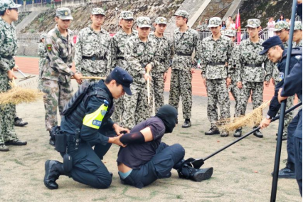 防恐防暴训练环节模拟了“歹徒”持械突然闯入校园的突发场景。在专业指挥下,学生代表迅速进入应急处置状态,利用防暴盾、钢叉等器械进行协同防卫,并通过擒拿控制技巧有效限制“歹徒”行动,最终成功实施合围并将其制服
