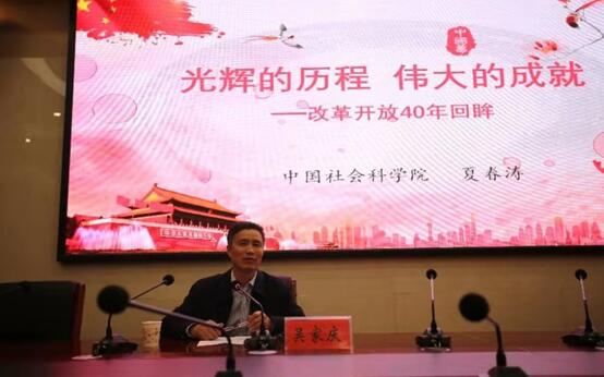 夏教授分析了改革开放的时代背景、回顾了40年的光辉历程及伟大成就、总结改革开放的深刻启示,展望了中国特色社会主义发展的未来前景。他指出党在改革开放过程中开创、坚持和发展了中国特色社会主义,形成了一系列新的理论成果,为坚定“四个自信”奠定了厚实的理论与现实基础。他认为40年的改革开放既成就了中国,也深刻影响了世界;40年的经验告诉我们:“一个中心,两个基本点“的基本路线是党和国家的生命线、是人民的幸福线;在国际风云变幻的今天,我们必须更加坚定维护以习近平同志为核心的党中央的权威和集中统一领导,走中国路,圆中国梦。