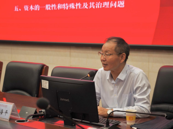邱海平教授从“什么是资本”“什么是资本主义”“社会主义为什么有资本”“公有制经济为什么采取资本的形式”,以及“资本的一般性和特殊性及其治理”等五个方面进行了科学严谨的学理分析、深入浅出的理论阐释。他认为,利用资本发展社会主义经济,是中国共产党和中国人民的一个伟大创造,是社会主义经济理论与实践的重大创新,必须坚持以习近平新时代中国特色社会主义思想为指导,加强资本问题研究,构建中国特色社会主义政治经济学的资本理论。互动交流环节,邱教授对在座师生的提问进行了认真分析与科学解答。