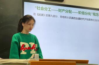 罗南敏同学根据“社会分工——财产分配——阶级分化”观念逻辑阐述了私有制的发展进程。她讲述了人类社会经历了三次大分工,其中,第一次分工发生在野蛮时代的中级阶段,这次分工大大提高了劳动生产率,并且带来了奴隶制。第二次分工发生在野蛮时代的高级阶段,这次分工的结果是人类社会开启了向私有制的过度,个体家庭成为社会的经济单位。第三次分工发生在文明时代之初,这使得社会中的人因经济生活条件而分裂为自由民和奴隶,这使得社会不仅再也不能调和这种对立,并且使这种对立日益尖锐化。因此,从家庭的分工到社会的分工,从氏族的共产到个体家庭的私有,从主人与奴隶的分化到富人与穷人的分化,恩格斯是在社会分工、财产分配、阶级分化三个维度上揭示了社会结构的变化,这些变化必然导致阶级矛盾日益尖锐。