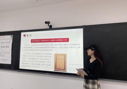 蒋丽思同学对《共产党宣言》的主要内容进行了介绍,并重点讲述了内容的第一章的内容。内容第一章:资产者与无产者。该部分运用历史唯物主义的观点,阐明了阶级斗争学说,分析了资产阶级和无产阶级产生、发展的历史及各自的特性、论证了无产阶级反对资产阶级斗争的必要性,揭示了资产阶级斗争必然灭亡和无产阶级必然胜利的客观规律。该同学对其中的“阶级斗争”观点进行了深入的阐发,首先,分析了阶级斗争是社会发展的直接动力;其次,阐述了资产阶级的历史作用和资本主义必然灭亡的历史趋势;再次讲述了无产阶级的形成和对资产阶级的反抗;最后,强调了无产阶级运动与过去一切运动的区别。第二章:无产者和共产党人。该部分阐明了共产党的性质、特点和奋斗目标;对资产阶级污蔑、攻击共产党人的种种谬论进行了批驳,澄清了是非、维护了共产党人的正确立场、观点和先进形象;还阐明了共产主义革命的任务和途径,展望了共产主义社会的理想图景。第三章:社会主义的和共产主义的文献。该部分对当时流行的各种社会主义思潮进行了评析,指出他们产生的社会历史条件,揭示了他们的主要内容和实质,分析了他们的社会作用及对工人运动的影响。由此,划清了科学社会主义与其他各种社会主义思潮的界限。第四章:共产党人对各种反对党派的态度。该部分通过论述共产党人对各种反对党派的态度,阐明了共产党的行动纲领,为共产党人开展斗争指明了道路。
