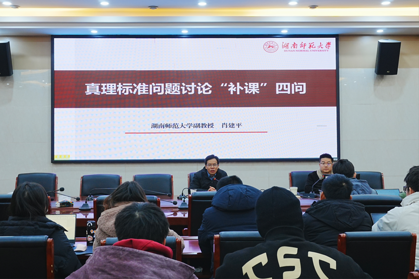 (通讯员 欧阳娴 谭邓碧萱 詹美婷)2026年1月5日晚,我院麓山·立德青年论坛(第一讲)在立德讲堂正式开讲。肖建平副教授应邀作题为《真理标准问题讨论“补课”四问》的专题报告。本次论坛由我院副院长陈德祥教授主持,党史党建方向硕博研究生及部分老师参加论坛。