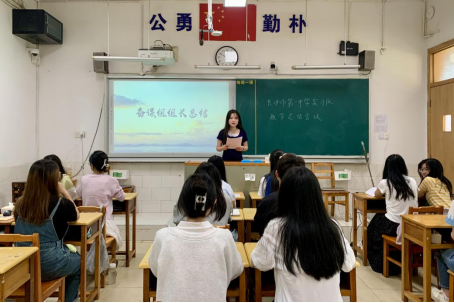 备课组组长刘芊芊、邓姝涵分别进行总结发言。刘芊芊结合教学实践,从课程设计、集体备课、课堂实施等,全面回顾了实习队在不同教学阶段的探索与实践,肯定了团队协作成效。邓姝涵表明要把握好学情,掌握好课堂节奏,建议继续改进后续教学。
